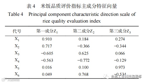 第三主成分方差贡献率为23.86%,能单独说明整个原始数据标准变异23.86%,通过线性方程Z3得出的特征向量绝对值最大的是弹性X5,其次是回复性X6,其值分别为0.973和−0.534,说明对第三主成分影响较大的指标为弹性和回复性。因此,第三主成分对应的是感官评价中米饭味道指标。