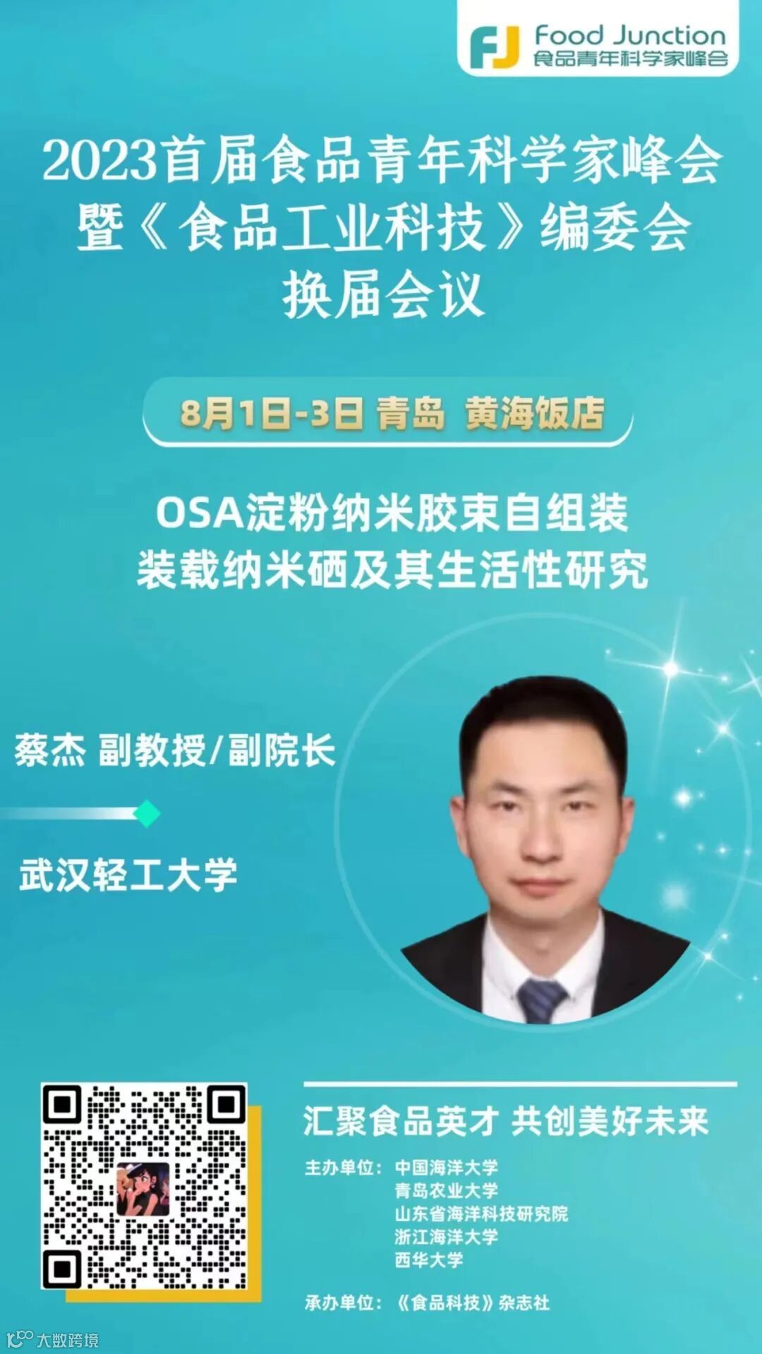 蔡杰,中共党员,博士,副教授,硕士生导师,现任武汉轻工大学硒科学与工程现代产业学院副院长。入选中国科协“青年人才托举工程”项目和湖北省省级人才计划,是中国农业技术推广协会富硒农业技术专业委员会副主任委员,《食品工业科技》首届青年编委,国际期刊《Food and Health》编委,《Foods》《Polymers》《Biosensors》客座编辑。主要在碳水化合物资源开发与利用、食品功能因子包埋与递送、含硒活性物质开发与功能评价等领域开展持续的研究。主持国家自然科学基金项目、湖北省自然科学基金项目、湖北省教育厅科研计划项目等10余项。在ACS Applied Materials & Interfaces,ACS Sustainable Chemistry & Engineering, Carbohydrate Polymers,Journal of Agricultural and Food Chemistry, Food Chemistry,Food Hydrocolloids等期刊上发表论文100余篇,授权国家专利10余件。