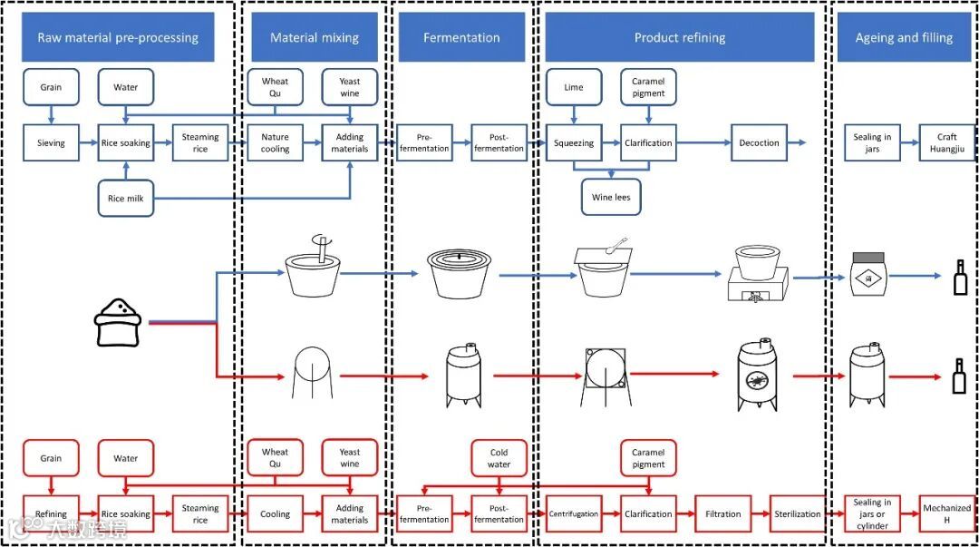 图 3. 作坊式黄酒和机械化黄酒的生产工艺。