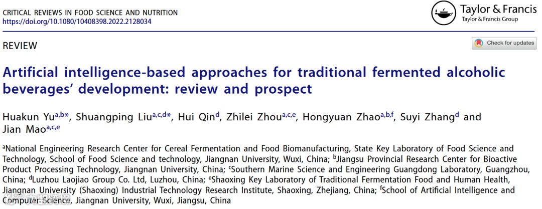 2022年10月31日,江南大学毛健、刘双平课题组联合泸州老窖张宿义等在国际食品TOP期刊Critical Reviews in Food Science and Nutrition(Q1,IF: 11.208)(点击查询最新即时IF和分区)发表题为“Artificial intelligence-based approaches for traditional fermented alcoholic beverages’ development: review and prospect”的综述性论文(点击查阅该刊投稿指南)。