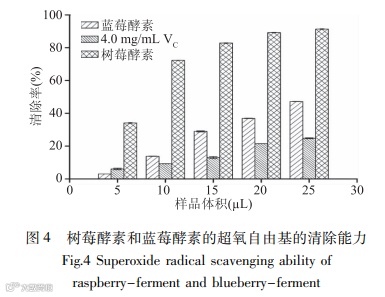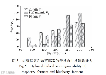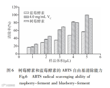 结果:HPLC分析结果表明:树莓酵素和蓝莓酵素中的有机酸均以酒石酸、乙酸和柠檬酸为主,同时因发酵代谢积累了少量丙酮酸、莽草酸和富马酸,而在蓝莓酵素中未检测到没食子酸。抗氧化活性研究表明:树莓酵素和蓝莓酵素的还原力、DPPH自由基清除能力、超氧自由基清除能力、羟基自由基清除能力和ABTS自由基清除能力均表现出浓度依赖性,树莓酵素的自由基清除能力总体优于蓝莓酵素。在实验剂量范围内,树莓酵素和蓝莓酵素DPPH自由基清除能力的IC50分别为2.00 mg Vc当量/mL和8.70 mg Vc当量/mL,还原力的IC50分别为4.53 mg Vc当量/mL和7.62 mg Vc当量/mL,超氧自由基清除能力的IC50分别为0.53 mg Vc当量/mL和2.05 mg Vc当量/mL,羟基自由基清除能力的IC50分别为8.92 mg Vc当量/mL和9.14 mg Vc当量/mL,ABTS+自由基清除能力的IC50分别为3.59 mg Vc当量/mL和6.81 mg Vc当量/mL。