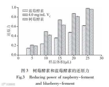方法:将新鲜树莓和蓝莓与红糖按质量比1.5:1,加入到已灭菌的玻璃瓶中,封口,放在暗处,常温下自然发酵1年,制备树莓酵素和蓝莓酵素,发酵结束后,将样品经高速离心得到上清液。采用高效液相色谱法(HPLC),色谱柱:Inertsil ODS-2, 150 mm×4.6 mm,选择0.02 mol/L KH2PO4溶液(用磷酸调pH=2.7)作为流动相,流动相流速:1 mL/min,温度:30 ℃,检测波长:210 nm,上清液样品用超纯水稀释10倍, 用0.22 μm滤膜过滤后直接进样,检测树莓酵素和蓝莓酵素中的有机酸种类和含量以Vc作为对照,以还原力、1,1-二苯基-2-三硝基苯肼(DPPH)自由基清除能力、超氧自由基清除能力、羟基自由基清除能力和2,2'-联氮双(3-乙基苯并噻唑啉-6-磺酸)二铵盐(ABTS)自由基清除能力作为抗氧化性指标,多体系地考察不同剂量的树莓酵素和蓝莓样品的体外抗氧化性能。