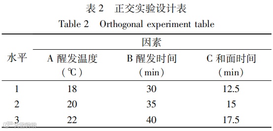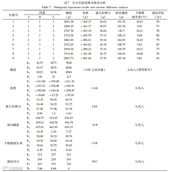 结果:随着马铃薯全粉添加量的增加,面条的干物质损失率逐渐增大(由8.85%上升到11.55%),面条的硬度、最大拉伸力和剪切硬度逐渐降低,而面条的粘性则逐渐增大,感官评分表明:当马铃薯全粉添加量在10%~20%之间时,制作的马铃薯全粉面条有浓郁的马铃薯香味,且蒸煮品质和质构品质较好。因此,选用马铃薯全粉添加量为15%的混合粉作为实验用粉,研究加工工艺对马铃薯全粉面条品质的影响。当和面时间从5 min增加到25 min时,面条的干物质损失率先降低后增加,在15 min左右时,干物质损失率最低;另外质构数据表明,熟面条的最大拉伸力先增加后减小,在和面时间为15 min时拉伸力达到最大值,因此,结合感官评价,确定正交实验的和面时间在15 min左右。随着醒发时间的增加,面条的硬度和最大拉伸力逐渐增大,当醒发时间为40 min时,面条的硬度达到最大值,最大拉伸力也较大,因此结合感官评价,确定正交试验的面絮醒发时间为30~40 min。当醒发温度从5℃上升到30 ℃时,马铃薯全粉面条的最大拉伸力逐渐增大,剪切硬度先增加后减小,在室温或略高于室温时剪切硬度、最大拉伸力大于低温醒发的马铃薯全粉面条,因此,结合感官评价,确定正交试验的醒发温度在20 ℃左右。通过上述单因素实验,设定和面时间12.5、15、17.5 min,醒发时间30、35、40 min,醒发温度18、20、22 ℃进行正交试验。