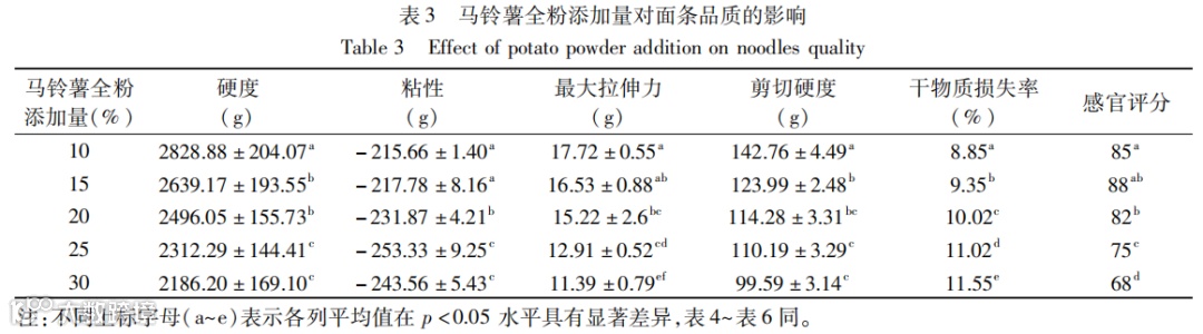 目的:马铃薯营养丰富,氨基酸组成全面,含有丰富的淀粉、膳食纤维,维生素和矿物质,具有保健功效。马铃薯全粉是以新鲜马铃薯为原料加工而成,保留了鲜薯的营养和风味,将马铃薯全粉与小麦粉混合制备马铃薯全粉面条不仅可以提升传统面条的营养价值,还可以促进马铃薯产业的可持续发展。