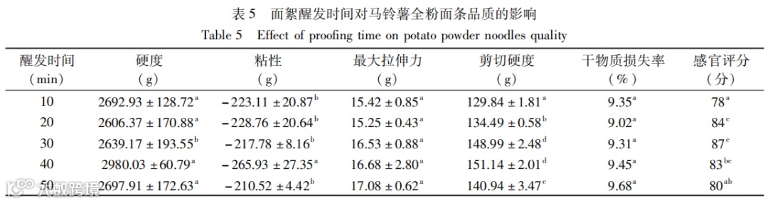 方法:为了考查不同的马铃薯全粉添加量、和面时间、醒发时间和醒发温度对马铃薯全粉面条质构品质和感官品质的影响,在小麦粉中分别加入10%、15%、20%、25%、30%的马铃薯全粉,得到混合粉300 g。在混合粉中分别加入35%、37%、40%、42.3%、43.3%的浓度为1.5%的食盐水,用小型多功能搅拌机进行和面,制备混合粉面团,考查和面时间(5、10、15、20、25 min)对面条品质的影响;然后将面团装入密封袋中,放入恒温培养箱醒发一定时间,考查醒发时间(10、20、30、40、50 min)和醒发温度(5、10、15、2、25、30 ℃)对面条品质的影响;醒发后的面带经过5次压延,最后用面刀切成1 mm厚、3 mm宽的面条,用于不同加工工艺条件下马铃薯全粉面条质构品质和感官品质的分析。