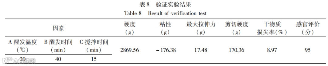 结论:正交试验和验证试验结果表明:当马铃薯全粉添加量为15%,和面时间为15 min,醒发温度为20 ℃,醒发时间为40 min时,制作的马铃薯全粉面条的干物质损失率为8.97%,最大拉伸力17.48 g,剪切硬度170.36 g,感官评分达95分,面条的质构品质和感官品质最佳。
