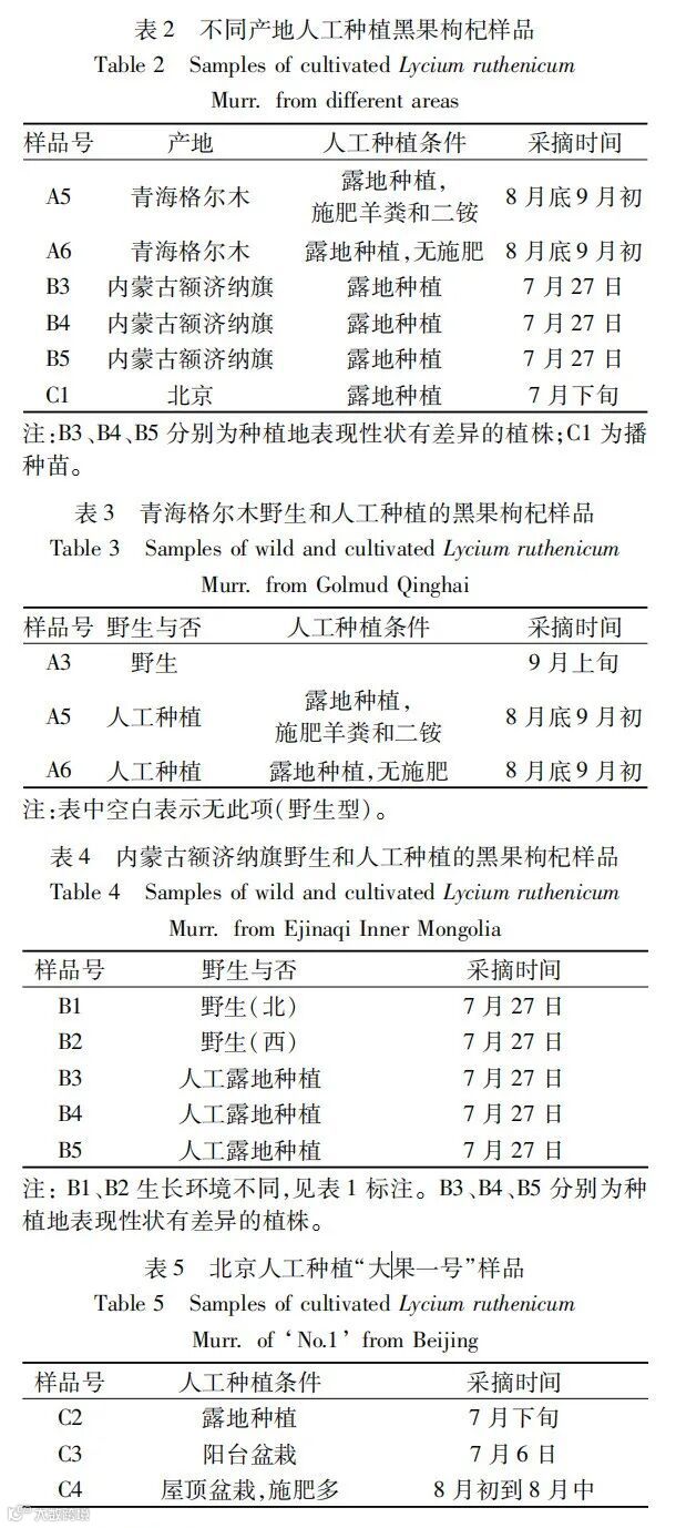 结果:1. 不同产地野生黑果枸杞中原花青素含量差别较大,范围为14.26 ~72.71 mg/g。其中含量最高的为A3号样品(72.71 mg/g),来自青海格尔木,显著高于其他地区(P<0.05)。原花青素含量大小顺序为:青海格尔木>新疆阿克苏>青海诺木洪>新疆库尔勒>内蒙古额济纳旗。花青素含量范围为0.69~7.86 mg/g,含量顺序与原花青素相同。说明在此五个地域,青海格尔木是最适宜黑果枸杞生长发育的产地,其果实中原花青素和花青素含量均最高。2. 不同产地人工种植的黑果枸杞中原花青素含量差别较大,范围为14.96~90.24 mg/g。其中含量最高的为C4号样品(90.24 mg/g),来自北京屋顶盆栽‘大果一号’且施肥多;其次为A5号样品(86.50 mg/g),来自青海格尔木露地栽培且施肥,均显著高于其他样品含量(P<0.05)。C2号含量高于C1,说明同为北京栽培,‘大果一号’品种果实中原花青素含量高于播种苗。C4样品含量显著高于C2和C3(P<0.05),说明模仿原产地高钾施肥有助于显著提高果实原花青素含量。花青素含量范围为0.95~8.40 mg/g,其中含量最高为A5和C4号样品(8.40 mg/g)。由此说明选择性状表现好的品种(如‘大果一号’)引种至北京栽培,且适当增大施肥量可使其原花青素和花青素含量达到原产地区人工栽培水平。3. 青海格尔木野生和人工种植的黑果枸杞中原花青素含量最高的为A5号样品(86.50 mg/g),为露地种植且施肥,显著高于A3(野生状态)和A6(露地种植无施肥)(P<0.05)。A5和A6号含量显著高于A3(P<0.05)。由此可知,人工种植条件下得到的果实中原花青素含量均高于野生状态下果实中原花青素含量,且露地种植同时施肥条件下含量显著高于无施肥条件下的含量。