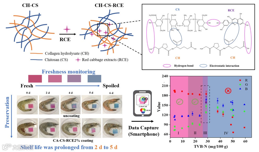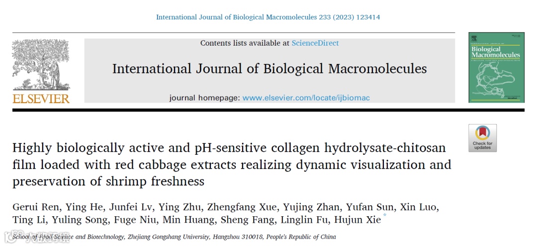 2023年1月,浙江工商大学任格瑞副教授、谢湖均教授在国际期刊International Journal of Biological Macromolecules(IF: 8.025)发表题为“Highly biologically active and pH-sensitive collagen hydrolysate-chitosan film loaded with red cabbage extracts realizing dynamic visualization and preservation of shrimp freshness ”的研究性论文。