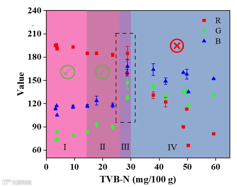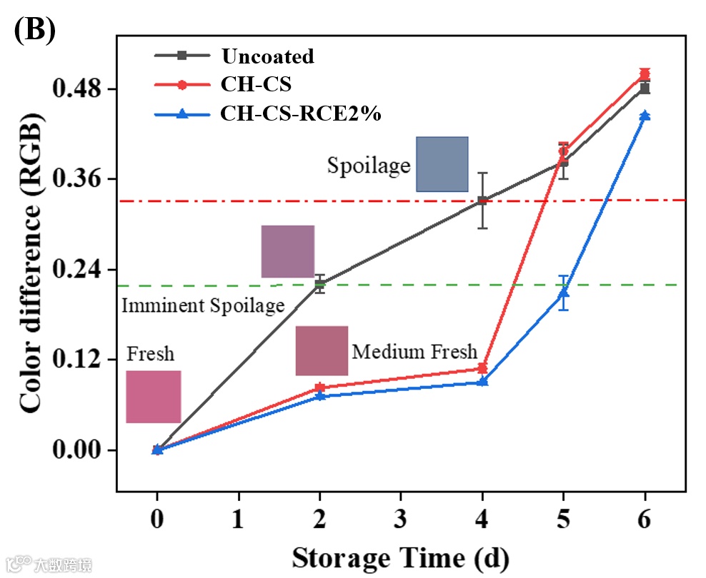 APP提取的颜色信息(RGB)有效提高了CH-CS-RCE2%膜鲜度指示的准确性。