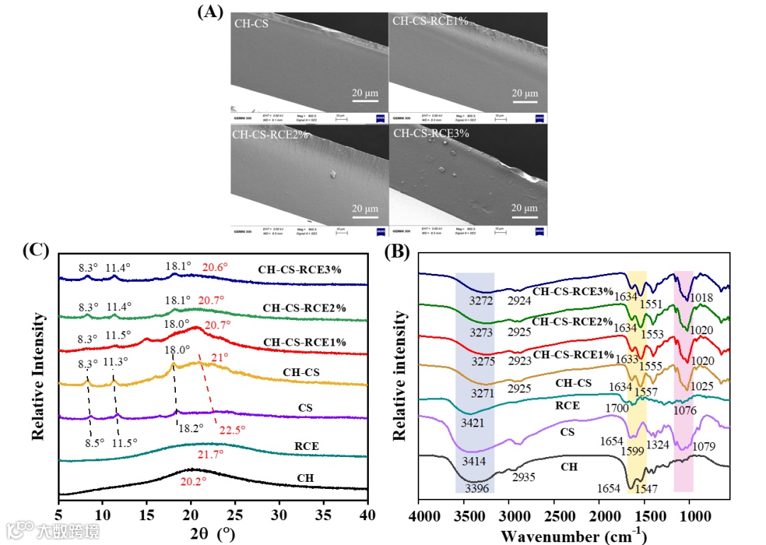 RCE改善了CH-CS膜的机械性能、阻隔性能和热稳定性,这主要归因于RCE与CH-CS之间的氢键和静电相互作用;