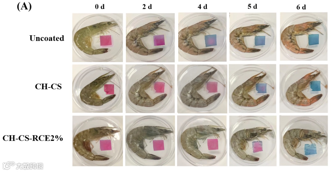 CH-CS-RCE2%膜对虾鲜度实现了动态可视化监测;