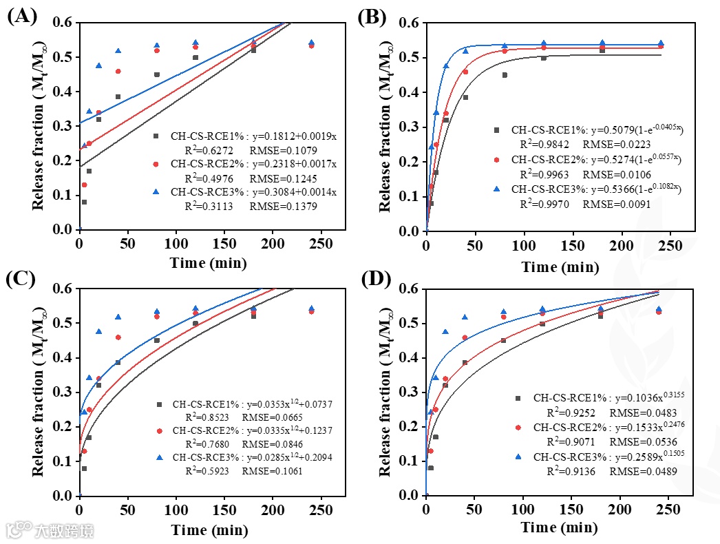 图8. RCE在薄膜中的释放模型拟合:零级(A),一级(B),Higuchi(C),Ritger and Peppas(D)