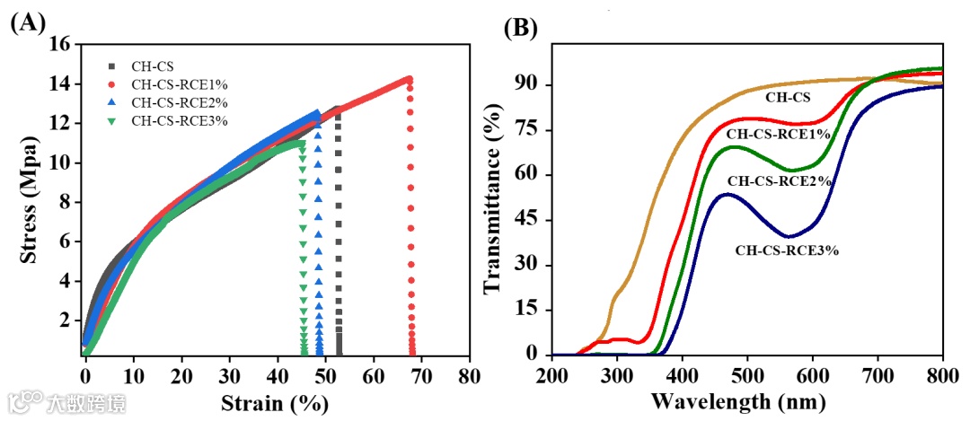 图2. CH-CS和CH-CS-RCE膜应力-应变曲线(A)和紫外-可见光透过率(B)