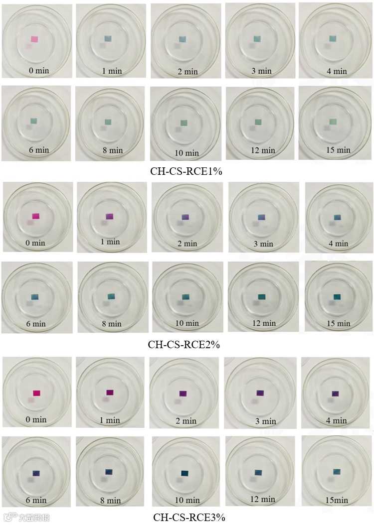 CH-CS-RCE2%膜在虾4 °C储藏期间发生了肉眼可辨的明显的颜色变化,虾的四个鲜度阶段:新鲜、次鲜、即将变质和变质,依次对应指示膜的红色、深红色、紫色和蓝色;