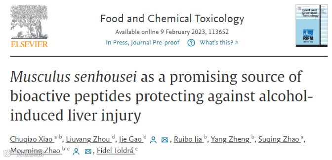 2023年2月,华南理工大学赵谋明教授课题组在毒理学顶刊 Food and Chemical Toxicology (IF: 5.572)发表题为“Musculus senhousei as a promising source of bioactive peptides protecting against alcohol-induced liver injury”的研究性论文。肖楚乔博士为本文第一作者,赵谋明教授和广西大学高洁博士为本文共同通讯作者。