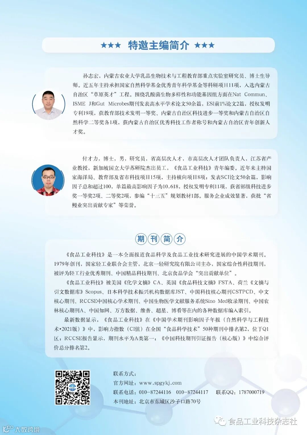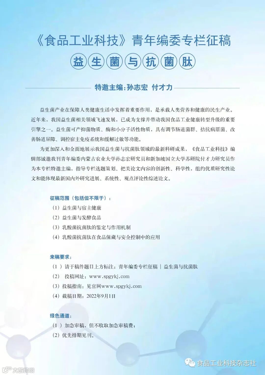 快速见刊:益生菌与抗菌肽专栏征稿 食品工业科技编辑部