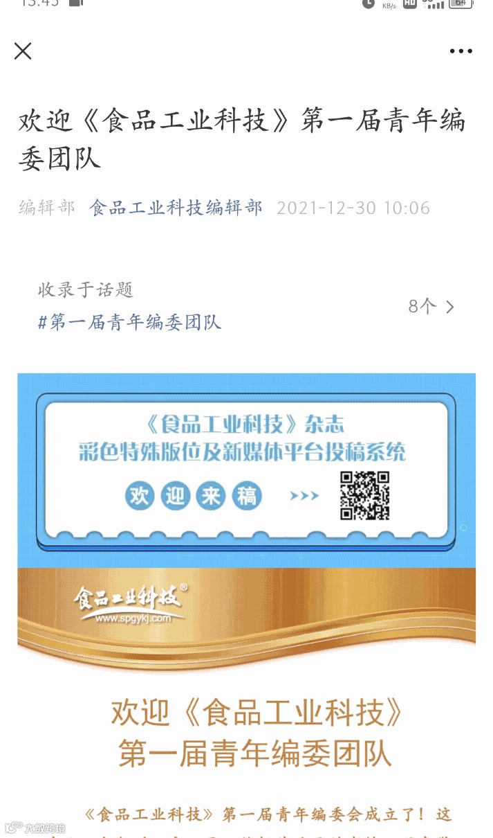 《食品工业科技》编辑部与作者、读者的交流平台。《食品工业科技》既是反映当前国内外食品工业技术水平的窗口,又是新技术应用推广的桥梁,面向科研、生产,满足各层次需求。