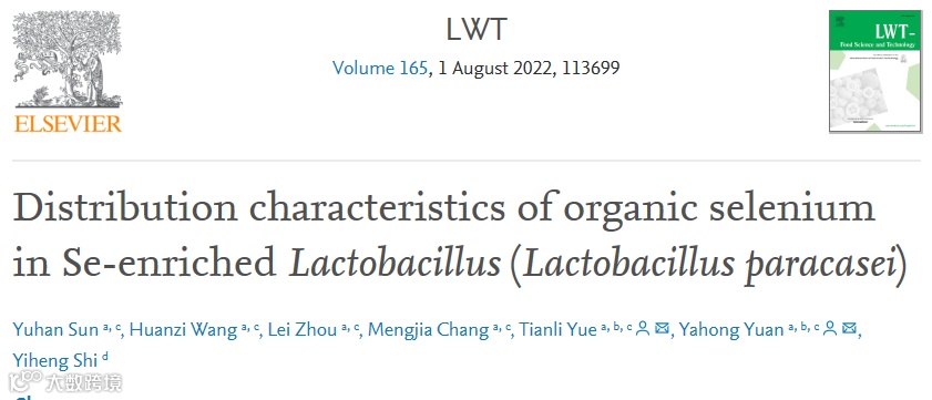 2022年8月,岳田利教授团队在国际期刊LWT-Food Science and Technology(Q1,IF: 6.05)发表题为“Distribution characteristics of organic selenium in Se-enriched Lactobacillus (Lactobacillus paracasei)”的研究性论文。论文第一作者为2021级博士孙雨涵,通讯作者为岳田利教授和袁亚宏教授,论文第一单位为西北农林科技大学。