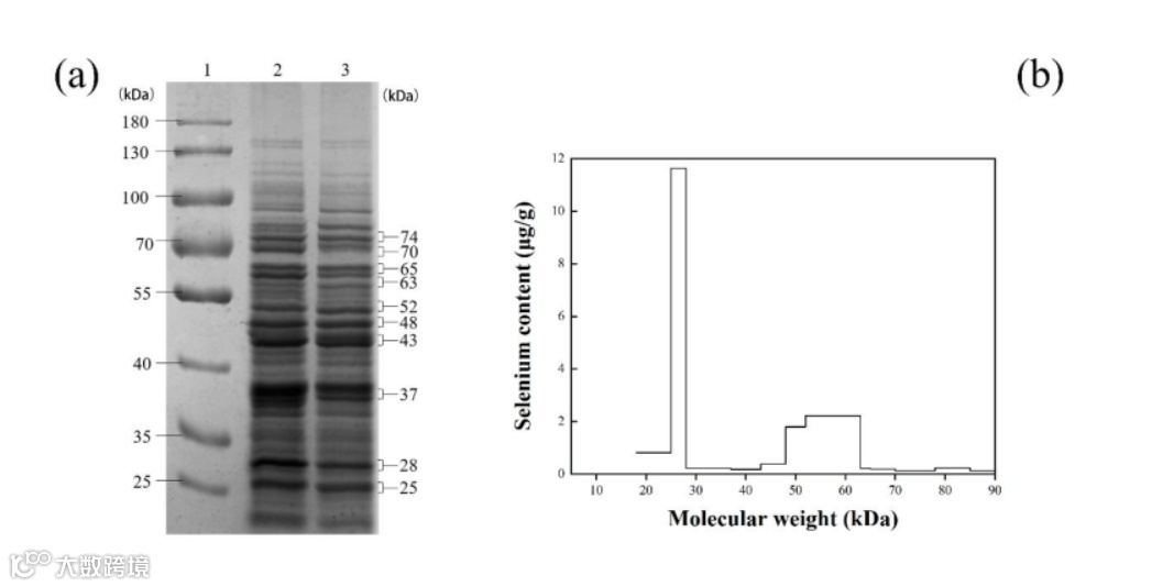 图2 蛋白质硒的分布特征。(a)蛋白的SDS-PAGE。Lane 1,蛋白质标记; Lane 2,对照组蛋白质; lane 3,富硒组蛋白。(b)副干酪乳杆菌蛋白质分子弯曲的硒含量。