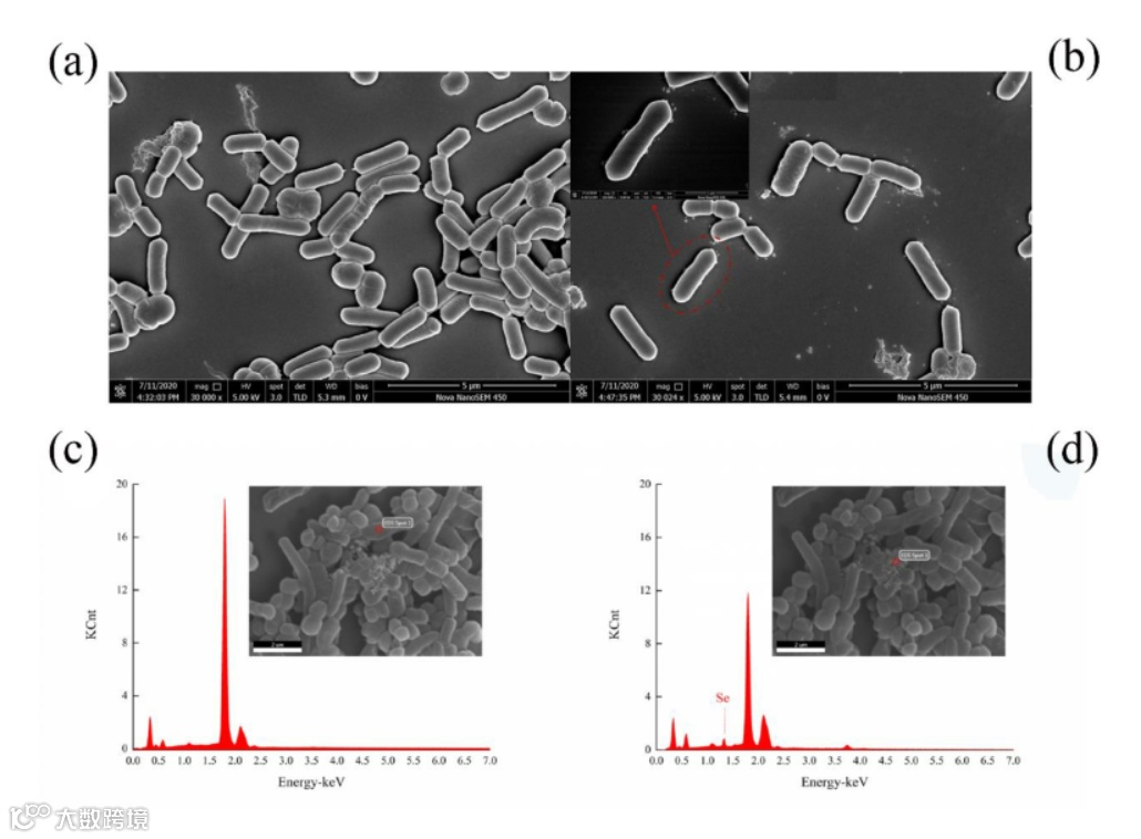 图1副干酪乳杆菌的SEM图像和EDS分析。(a)亚硒酸盐0µg/mL条件下菌体生长的SEM图像。(b) 6 µg/mL亚硒酸盐中菌体生长的SEM图像。(c)不含硒副干酪乳杆菌的EDS分析。(d)副干酪乳杆菌与硒颗粒的EDS分析。