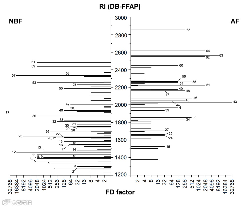 采用SAFE法结合GC-O-MS和HS-SPME-GC−O/MS对大红袍挥发性香气成分进行提取和鉴定。共鉴定出65个FD ≥ 32的香气化合物。AEDA实验结果表明,苯乙醇和4-羟基-2,5-二甲基-3(2H)呋喃酮的FD因子最高,为32768。 -