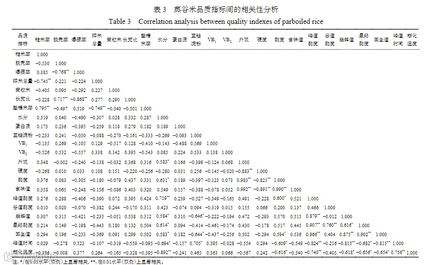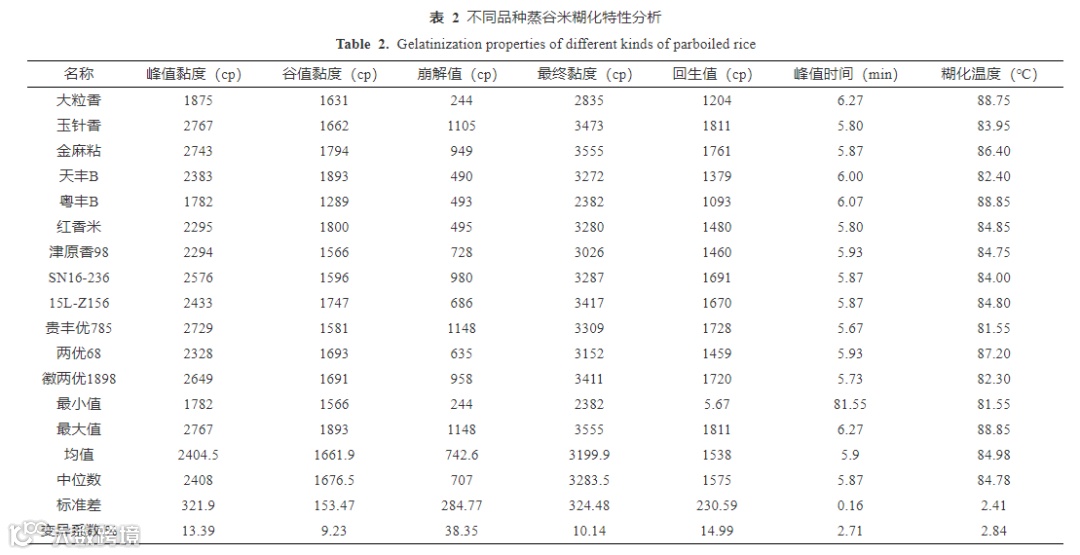 近几年,关于蒸谷米的研究主要集中在不同浸泡方式、干燥条件和工艺技术优化等对蒸谷米品质变化的影响。周显青等通过实验研究发现柠檬酸浸泡会改变蒸谷糙米的颜色,提高蒸谷米单位时间的碾减率,同时对蒸谷米的营养物质以及蒸煮特性和食味品质均有显著性影响。高雅文等比较分析不同干燥方式对蒸谷米品质的影响,结果得出微波干燥蒸谷米的品质相对较优。刘园等通过考察不同工艺条件对蒸谷米营养品质和食用品质的影响,从而确定制备蒸谷米的最佳工艺条件。Chanakan等将稻谷经铁离子浸泡液处理后制备成蒸谷米,实现了铁强化蒸谷米,同时还发现其生物利用率提高。但是,针对不同品种稻谷制备蒸谷米并对其品质性状和糊化特性进行系统分析评价的研究鲜有报道,因此探讨不同品种稻谷制备蒸谷米并评价分析其品质特性对蒸谷米专用稻筛选及稻米制品深加工具有重要意义。