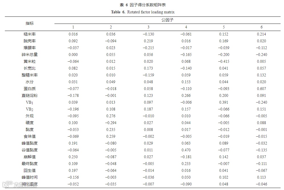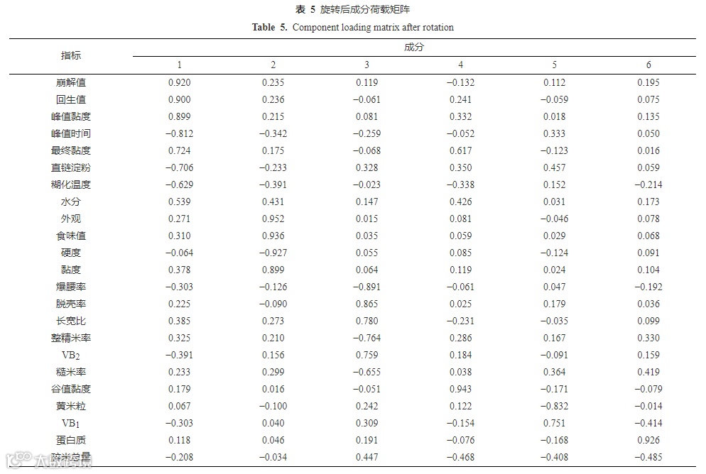 成分荷载是主成分与变量的相关系数,其数值大小表示原有变量在降维后所构成的综合变量中的贡献率高低,同时相对于一个变量而言,荷载绝对值越大的主成分与其关系越密切,也更能代表这个变量。结合表4和表5可知,主成分1的特征值和累积方差贡献率分别为8.826和38.373%,与崩解值、回生值、峰值黏度和峰值时间等指标荷载绝对值相对较高,表明主成分1主要代表的是蒸谷米糊化特性指标的相关信息;主成分2的特征值是4.516,累积方差贡献率为58.008%,与外观、食味值、黏度和硬度等指标荷载绝对值较高,表明主成分2主要反映的是蒸谷米食味品质指标的相关信息;主成分3的特征值为2.747,累积方差贡献率为69.951%,与爆腰率、脱壳率、长宽比和整精米率等指标具有较高的荷载绝对值,表明主成分3主要代表的是蒸谷米加工品质指标的相关信息;主成分4的特征值为1.919,累积方差贡献率为78.294%,与谷值黏度的荷载绝对值相对较高,其次是最终黏度,表明主成分4主要反映的是蒸谷米糊化特性指标中黏度的相关信息;主成分5的特征值和累积方差贡献率分别为1.539和84.984%,与黄米粒和VB1具有相对较高的荷载绝对值;主成分6的特征值是1.403,累积方差贡献率为91.083%,与蛋白质的荷载绝对值相对较高,表明主成分6主要代表蒸谷米品质指标中蛋白质的相关信息。