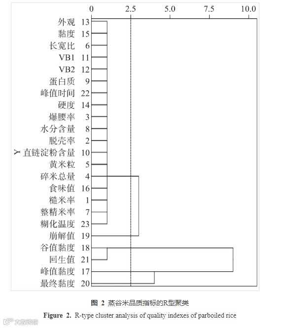 目前,主成分和聚类分析方法已广泛应用于果蔬原料筛选及各类食品加工品质评价分析。有学者运用主成分和聚类分析法对62种裸燕麦进行分类并测定其脂肪酸含量,建立了燕麦的脂肪酸标准指纹图谱;孟庆虹、扶定等分别以粳稻品种和籼型杂交稻品种为试材,应用主成分和聚类分析方法考察相关品质指标的变化趋势,确定了代表性品质指标并对其稻米品质特性进行了综合评价及分类。因此,宫彦龙 、朱速松团队选取12个不同品种的稻谷原料并将其制备成蒸谷米,采用主成分分析和聚类分析方法对蒸谷米品质性状及糊化特性进行系统分析,探索不同品种稻谷制得的蒸谷米品质特性的差异性和关联性,筛选出最适制备蒸谷米的专用稻品种及影响蒸谷米品质的关键性指标,旨在为蒸谷米专用稻的选育和蒸谷米制品的研发应用提供理论基础和科学依据。