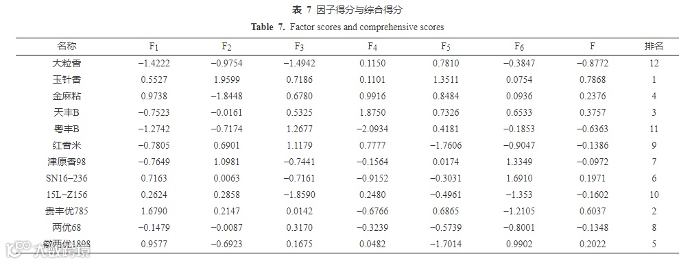 图1和表4反映了不同品种稻谷制得的蒸谷米品质性状的主成分分析结果。一般认为当主成分特征值大于1且累积方差贡献率大于85%时,就可利用所提取的主成分表示原始变量大部分主要信息。图1为主成分特征值的碎石图,根据碎石图中曲线坡度的陡峭程度,可以直观的反映各成分的变化趋势,进而明确主成分的提取数量。由图1可知,前6个主成分的特征值呈快速下降的趋势,但从第7个主成分特征值开始,碎石图曲线缓慢下降并趋于平稳状态;同时由表4可知,前6个主成分的累积方差贡献率为91.083%,即这6个主成分包含了原始变量91.083%的信息,具有较高的代表性,且其特征值分别为8.826、4.516、2.747、1.919、1.539和1.403,均大于1,表明这6个主成分已经基本涵盖了蒸谷米品质性状的所有信息。结合图1和表4的分析结果,应选取前6个主成分作为受试材料品质评价分析的指标。