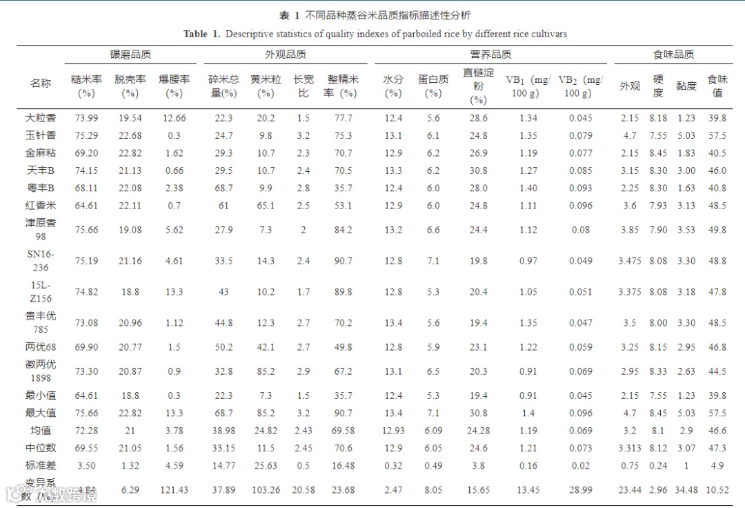对12个不同品种稻谷制得的蒸谷米的碾磨品质、外观品质、营养品质和食味品质各指标进行描述性分析,结果如表1所示。由表1可知,“大粒香”具有最低的碎米总量、长宽比、水分含量、VB2、外观、黏度和食味值;“玉针香”的长宽比、外观、黏度和食味值最高,而其爆腰率和硬度最低;“金麻粘”具有最高的脱壳率和硬度;“天丰B”直链淀粉含量最高;“粤丰B”具有最高的碎米总量和VB1含量以及最低的整精米率;“红香米”具有最高的VB2含量和最低的糙米率;“津原香98”的糙米率最高,其黄米粒最低;“SN16-236”具有最高的整精米率和蛋白质含量;“15L-Z156”具有最高的爆腰率以及最低的脱壳率和蛋白质含量;“贵丰优785”的水分含量最高,其直链淀粉含量最低;“徽两优1898”具有最高的黄米粒和最低的VB1含量。上述结果表明,不同品种稻谷制得的蒸谷米各项品质指标之间均存在差异性。同时,实验结果还发现,蒸谷米品质指标间变异系数各不相同,说明不同品种稻谷制得的蒸谷米在不同品质性状之间呈现不同程度的变化。其中,在碾磨品质中,蒸谷米糙米率和脱壳率的变异系数均<10%,分别为4.84%和6.29%,而爆腰率的变异系数>10%,为121.43%,表明爆腰率对蒸谷米碾磨品质的影响较大,而糙米率和脱壳率这2个指标相对较稳定;在外观品质中,蒸谷米各项指标的变异系数均>10%,变异系数从高到低依次为:黄米粒、碎米总量、整精米率、长宽比,说明不同品种稻谷制得的蒸谷米外观品质指标差异较大;在营养品质中,蒸谷米水分和蛋白质含量的变异系数均<10%,分别为2.47%和8.05%,而VB1、VB2和直链淀粉含量的变异系数均>10%,分别为13.45%、28.99%和15.65%,表明不同品种稻谷对蒸谷米VB2、直链淀粉和VB1含量的影响相对较大,其次为蛋白质和水分含量;在食味品质中,蒸谷米外观、黏度和食味值的变异系数均>10%,分别为23.44%、34.48%和10.52%,而硬度的变异系数<10%,仅为2.96%,表明外观、黏度和食味值对蒸谷米食味品质的影响较大,而硬度对蒸谷米食味品质的影响相对较小。通过比较均值和中位数发现,除蒸谷米爆腰率和黄粒米外,其余各项指标的中位数均接近平均数,说明这些指标测定值的离群点较少。综合蒸谷米品质指标描述性分析结果可知,实验所选蒸谷米受试材料各项指标测定值均在可接受范围内,其品质特性差异较大,具有一定的广泛性和代表性。