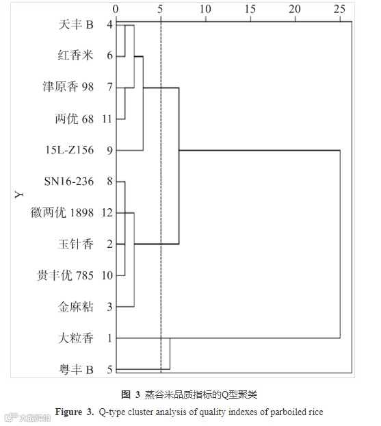 由图3可知,在欧氏距离为5时,制备蒸谷米的12个稻谷品种可划分为4类,第1类为“天丰B”、“红香米”、“津原香98”、“两优68”、“15L-Z156”;第2类为“SN16-236”、“徽两优1898”、“玉针香”、“贵丰优785”、“金麻粘”;“大粒香”和“粤丰B”分别单独聚为第3类和第4类。同时,结合主成分分析中因子得分与综合得分结果可知,由“玉针香”制得的蒸谷米的综合得分最高,即蒸谷米品质最佳,“贵丰优785”和“金麻粘”的综合得分次之,且其与“玉针香”同聚为一类,故这3个稻谷品种制得的蒸谷米品质之间存在密切的相关性,结果表明“玉针香”、“贵丰优785”和“金麻粘”均属于品质较优的一类,而“大粒香”的品质最差,其次为“粤丰B”。