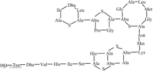 乳酸链球菌素分子常以二聚体或四聚体的形式存在 ,其含有一些修饰性的氨基酸残基,包括羊毛硫氨酸(Lanthionine)、8-甲基羊毛硫氨酸(8 -methylanthionine) 、甲基脱氢丙氨酸(Dehy drobutyrine,Dhb) 以及脱氢丙氨酸(Dehydroalanine, Dha)等。乳酸链球菌素的分子结构式如图1所示。