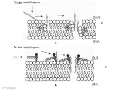 对于乳酸链球菌素的抑菌机理国内外学者进行了较长时间深人研究 ,但目前对其机理还未有明确 的定论 ,许多学者也在进一步研究中。有研究表明 , 乳酸链球菌素可以改变有害微生物细胞的 pH,使细胞濒临死亡;也有些学者认为乳酸链球菌素之所以可以抑制细菌生长, 是因为乳酸链球菌素分子中脱氢丙氨酸(DHA) 和 8 -甲基脱氢丙氨酸(DHB)可以与细菌细胞膜上的某些酶发生化学反应,从而使细菌细胞内物质流出,进而导致细胞裂解死亡;而Zhao等分析金黄色葡萄球菌基因表达谱指出,乳酸链球菌素可以通过阻碍金黄色葡萄球菌中主要功能性基因的转录,来抑制金黄色葡萄球菌的生长和繁殖,从微观的方面也对乳酸链球菌素的抑菌机理提供了重要的线索而在众多乳酸链球菌素的抑菌机理中, " 孔道理论"得到了较为广泛的认同 ,并且也是近年来许多 学者研究的热点。 "孔道理论" 主要是指乳酸链球菌 素可以使微生物细胞膜中形成孔道 , 导致细胞内三 磷酸腺苷、核苷酸以及氨基酸等小分子物质快速流出,导致细胞的生物合成过程受 ,从而使微生物细 胞裂解死亡。其主要有两种模式 ,第一种是" 楔形" 模型 ,是指乳酸链球菌素与细胞膜紧密结合后, C端 与微生物细胞脂质的静电吸引力会使得乳酸链球菌 素慢慢插人到脂质双分子层,从而在膜上形成孔道。 而且少量即微摩尔浓度的乳酸链球菌素便可形成这 种孔道模型,如图2(a)所示;第二种模式是乳酸链球 菌素的 N端可与微生物细胞壁的合成前体脂质s相结合 ,将其作为后续孔形成的对接分子 , 阻止前体脂质s参与肽聚糖的合成 ,从而破坏细胞壁并形成高度特异性的孔,而且该孔道比第一种模式形成的孔径更大且更稳定 ,如图2(b)所示。
