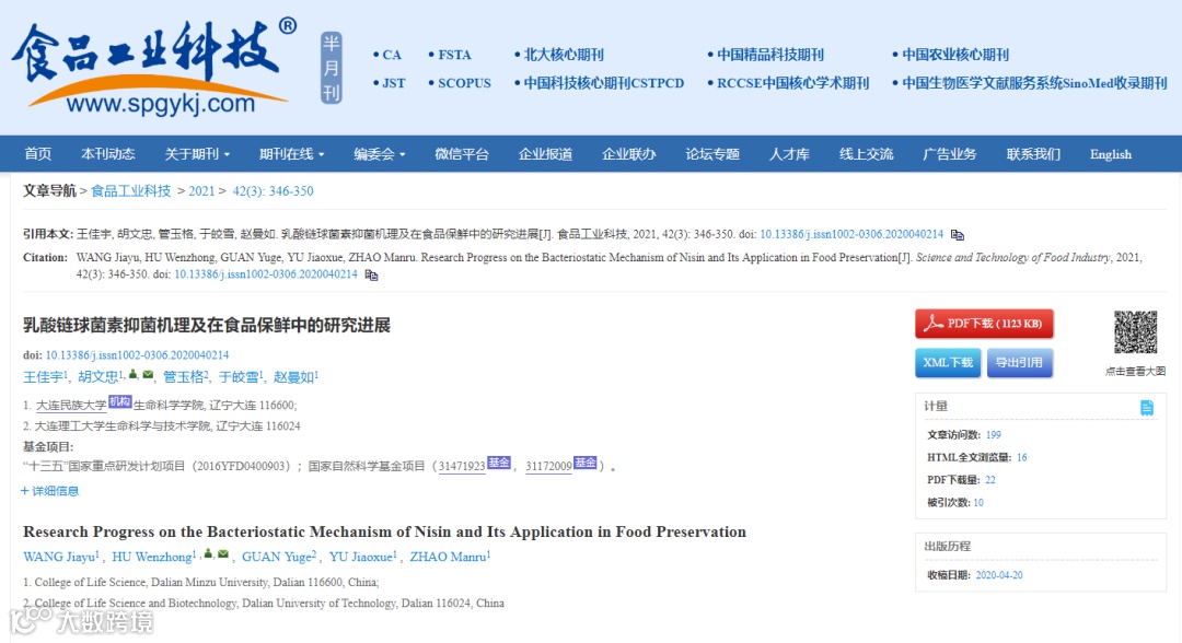 微生物是引起食品腐败变质的主要原因,使用防腐剂可以有效减缓食品腐败变质的发生,延长产品货架期。而大多数研究学者考虑到仲丁胺、扑海因、抗菌灵等化学防腐剂的残留安全性问题,绿色、 安全、高效的天然生物防腐剂近年来逐渐成为食品。保鲜领域的研究热点。而乳酸链球菌素作为一种安全无毒的天然防腐剂,早于1969年就被世界卫生组织(WHO)批准用作食品防腐剂,并于1988年被美国食品药品管理局FDA)列人一般公认安全 (Generaly Recognizedassafe,GRAs)名单。而且由于乳酸链球菌素(Nisin)摄人后可快速被人体中的 蛋白酶(如胰蛋白酶、胰酶、唾液酶等)消化分解为各种氨基酸,不会对人体产生毒副作用,因此其近年来已被商业化广泛应用于食品保鲜行业。乳酸链球菌素又称为乳链菌肽,是由乳酸乳球菌乳酸亚种(Laclococcuslaclissubsp.Lactis)某些菌株代谢过程中合成的一种含有34个氨基酸残基的多肽型生物防腐剂。乳酸链球菌素具有良好的抑菌性,可有效 地抑制金黄色葡萄球菌、枯草芽孢杆菌、单增李斯特菌、嗜热链球菌等革兰氏阳性菌的生长,尤其是细菌芽孢的生长。胡文忠团队主要是对乳酸链球菌素的抑菌机理及其近10年来在食品保鲜领域中的应用进行介绍,并讨论了其在今后的发展方向,以期为乳酸链球菌素在食品保鲜应用中的进一步研究和开发提供参考。
