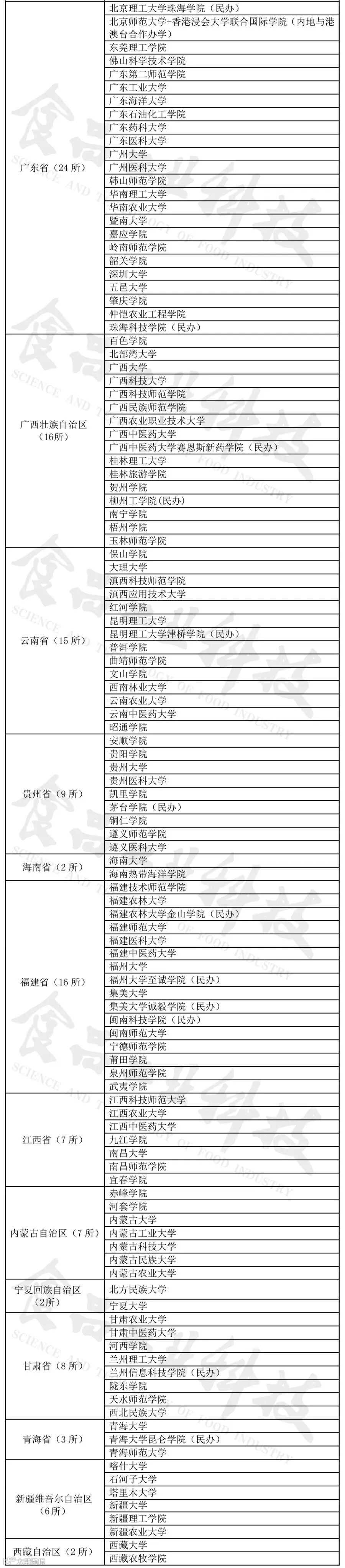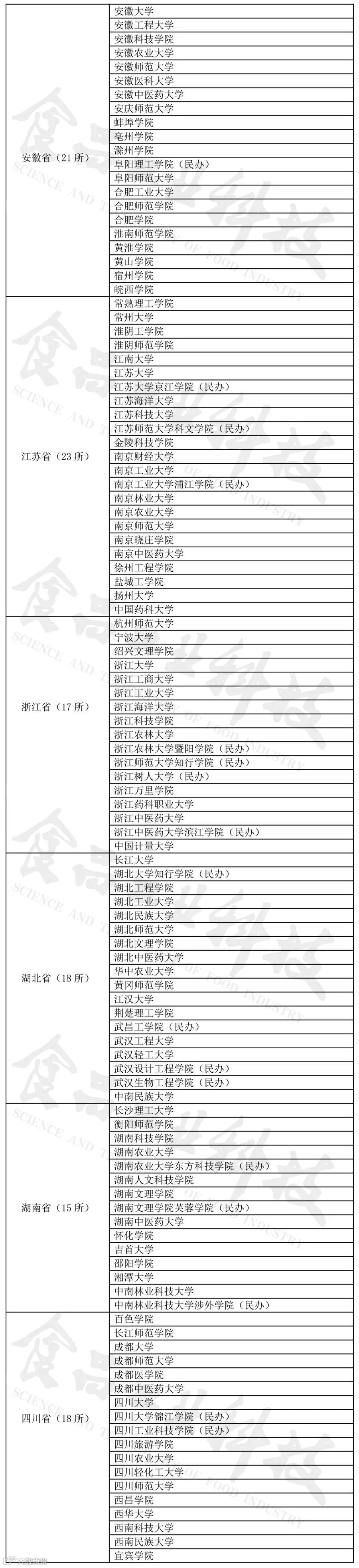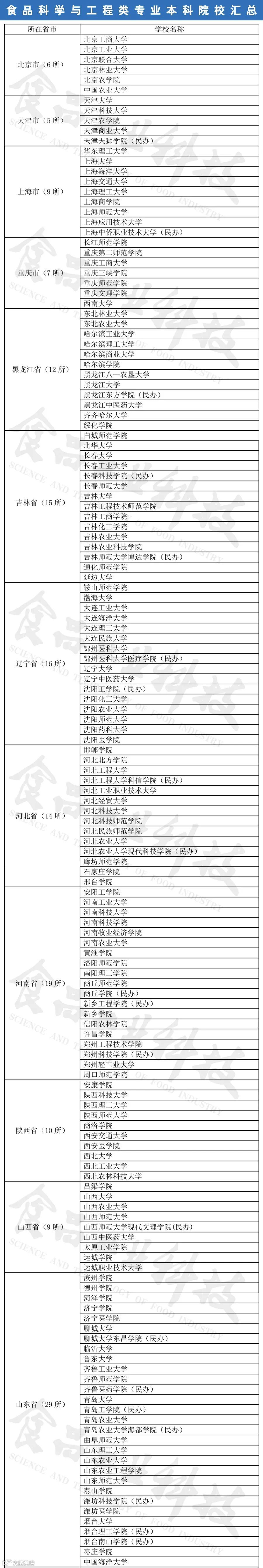 随着我国食品工业及高校的发展,越来越多的高校开设了食品科学与工程类本科专业(根据教育部发布的《普通高校本科专业目录》食品科学与工程类专业包括食品科学与工程、食品质量与安全、粮食工程、乳品工程、酿酒工程、葡萄与葡萄酒工程、食品营养与检验教育、烹饪与营养教育、食品安全检测、食品营养与健康、食用菌科学与工程、白酒酿造工程共12个专业)。为此,《食品工业科技》编辑部邀请内蒙古农业大学的赵丽芹教授,对我国开设食品科学与工程类专业的本科院校进行汇总,为广大学子提供参考。