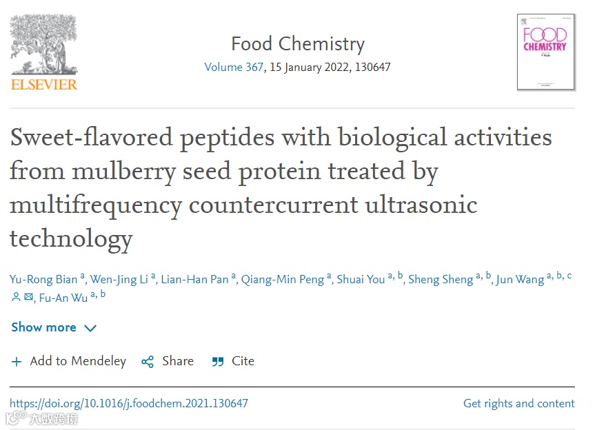 近日,江苏科技大学卞宇嵘硕士(第一作者)、王俊教授(通讯作者)等在国际食品期刊《Food Chemistry》(JCR一区,IF 7.514)在线发表了题为“Sweet-flavored peptides with biological activities from mulberry seed protein treated by multifrequency countercurrent ultrasonic technology”的研究论文。