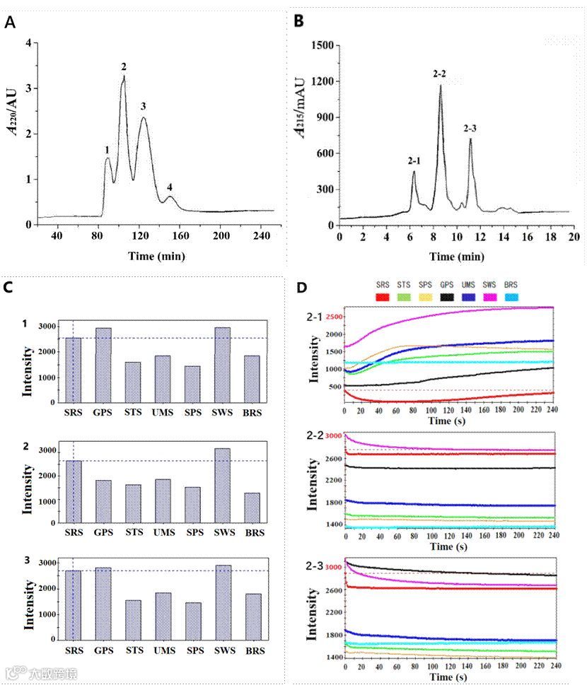 图 2 桑籽蛋白水解物的分离纯化及各组分甜度检测。(A)凝胶过滤色谱图;(B) RP-HPLC色谱图;(C)凝胶过滤层析各组分甜度检测;(D) RP-HPLC分离组分甜度检测