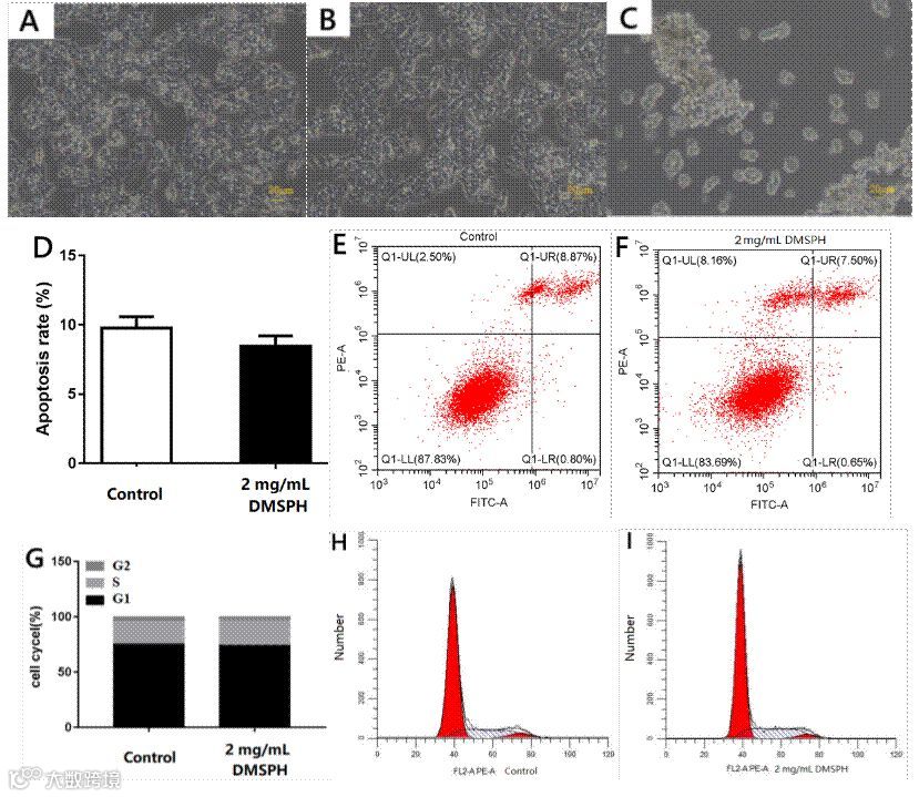 图 3 桑籽蛋白水解物对HepG2细胞的影响:(A)空白对照组;(B)未超声处理组;(C)多频逆流超声处理组。流式细胞术分析桑籽蛋白水解物处理Annexin V-FITC/PI双染色细胞24 h:(D)凋亡细胞数量;(E)对照组和(F)实验组细胞凋亡情况。流式细胞术分析桑籽蛋白水解物处理PI染色细胞24 h:(G) HepG2细胞周期比;(H)对照组和(I)实验组细胞周期的流式细胞分析。