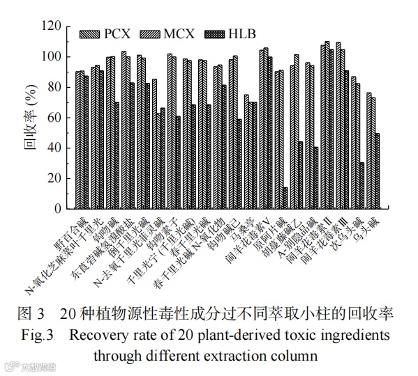 因目标成分均为生物碱类物质,在碱性条件下较易洗脱,故选择5%氨化甲醇作为洗脱溶剂。分别考察了5、9、15 mL 5%氨化甲醇3种洗脱剂对目标分析物的影响,综合考虑目标分析物的洗脱效果和节省溶剂等因素,最后选择9 mL 5%氨化甲醇作为洗脱溶剂,能够达到最佳洗脱效果。