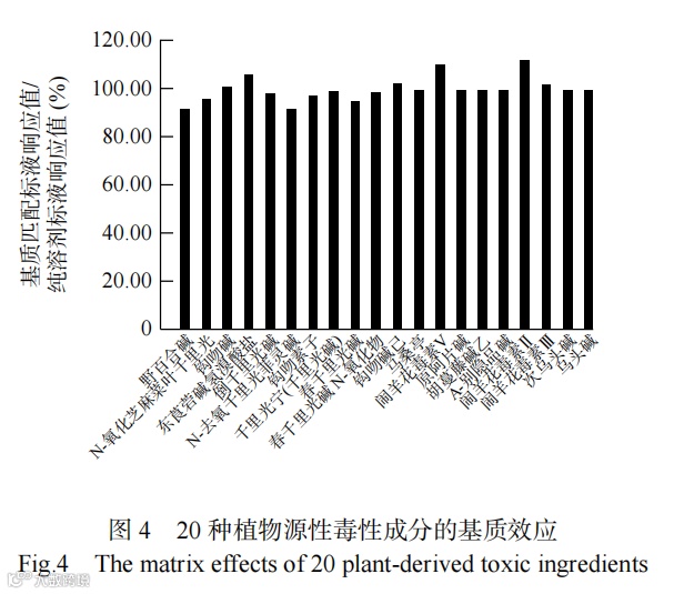分别称取1.00 g 样品六份,置于15 mL聚丙烯具塞离心管中,分别添加0.02 mL的混合标准中间溶液(加入量约200 ng),制备并依法测定。结果测得野百合碱、钩吻碱、东莨若碱氢溴酸盐、倒千里光碱、钩吻素子、千里光宁、钩吻碱己、马桑亭、闹羊花毒素Ⅱ、闹羊花毒素Ⅲ、闹羊花毒素V、原阿片碱、A-别隐品碱、次乌头碱、乌头碱、春千里光碱、春千里光碱N氧化物、N-氧化芝麻菜叶千里光、胡蔓藤碱乙、千里光菲灵碱的RSD分别为0.8%、1.3%、1.6%、1.1%、0.8%、1.9%、2.1%、1.4%、0.8%、0.6%、1.3%、0.7%、0.5%、2.4%、1.8%、1.6%、1.1%、0.5%、1.8%、2.0%,表明方法重复性良好。