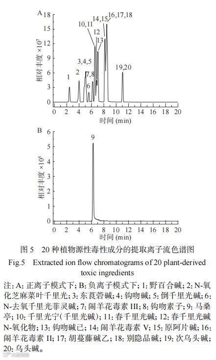 通过TraceFinder软件建立的数据库与样品的保留时间、主要二级碎片、同位素分布和二级质谱图相识度比对等多种方法,综合判断,以得到准确定性结果,避免假阳性检测结果的出现。实现多组分无对照同时筛查的定性分析。具体分析物质的准确质量数及碎片离子、保留时间、电离模式如表1所示;20种植物源性毒性成分的提取离子流色谱图见图5。