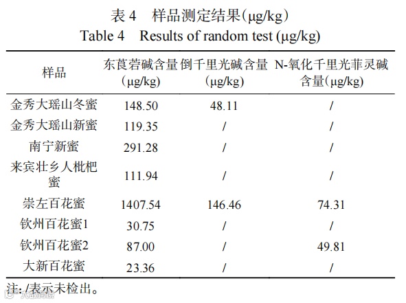 将66批蜂蜜样品进行测定,结果发现在8批蜂蜜样品中检出东莨若碱,含量在20~1400 ug/kg之间;其中2批蜂蜜中另检出倒千里光碱,含量在48~150 ug/kg 之间;2批蜂蜜中检出N-氧化千里光菲灵碱含量在49~80 ug/kg之间,详情见表4,结果表明,在蜂蜜中检出有毒化合物占12%,在蜂蜜中存在一定的食品安全风险。