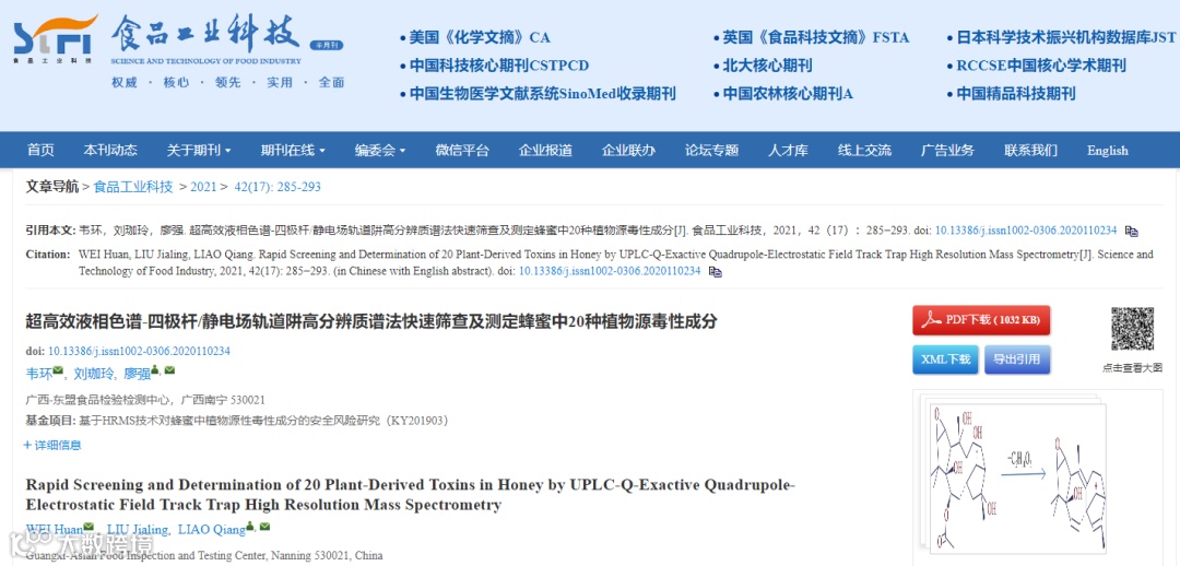 因此,廖强团队以固相萃取法纯化样品,应用高效液相色谱-四极杆/静电场轨道阱高分辨率质谱联用技术,建立蜂蜜中20种植物源毒性成分的快速筛查和测定方法,基于高分辨质谱的精准分子量和多级碎片信息确立了20种植物源毒性成分的质谱数据库。该方法快速、准确、通量高,为进一步开展蜂蜜溯源,安全性评价和监测评估食用蜂蜜中毒提供参考,保障了蜂蜜的食用安全和提升了质量控制水平。