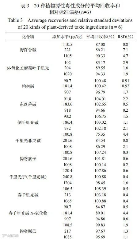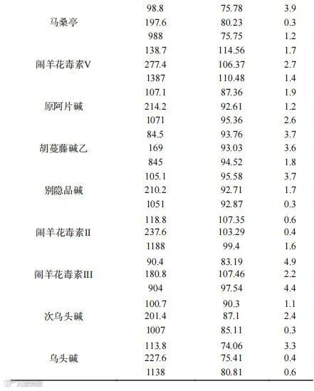 分别称取1.00 g 样品18份,置于15 mL聚丙烯具塞离心管中,分别添加0.01、0.02、0.1 mL的混合标准中间溶液各6份,进行低、中、高3个浓度水平的加标回收试验进样分析,计算加样回收率(结果见表3;结果如表所示各植物源性毒性成分回收率介于74.1%~114.6%之间,表明本检测方法的准确度高,可满足实验室的日常分析需求。