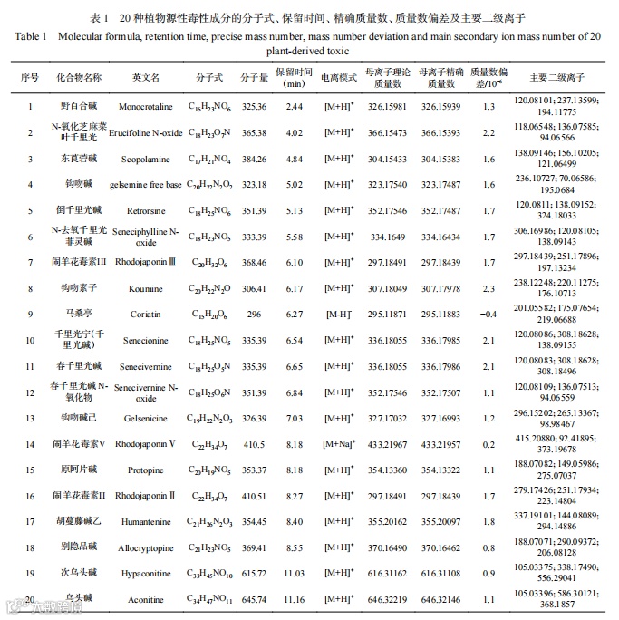 《食品安全国家标准蜂蜜》(GB 14963-2011)中明确规定“蜜蜂采集植物的花蜜、分泌物或蜜露应安全无毒,不得来源于雷公藤、博落回、狼毒等有毒蜜源植物。”但并未列出具体植物源毒性成分和相关检测方法。目前国内对植物中相关毒性物质的检测方法主要有液相色谱法、气相色谱法、酶联免疫吸附分析、薄层层析测定法、气相色谱-质谱法、液相色谱-质谱法等。液相色谱法检测灵敏度较低,适合于含量较高的样品如中草药;酶联免疫吸附分析法酶活性易损失、无法对各类成分进行准确定量分析;气相色谱-质谱法及液相色谱-质谱法均可实现微量衡量同时多组分分析,是目前司法鉴定主要方法,但气相色谱-质谱法不适用于热不稳性及高沸点化合物,液相色谱-质谱法可有效解决这样难题,但传统的三重四极杆质谱需要标准物质实现定性确证。高分辨质谱仪可依据其高质量准确度、高质量分辨率的全扫描数据在不需要标准物质的情况下实现定性确证,在食品定向和非定向筛查中广泛应用。