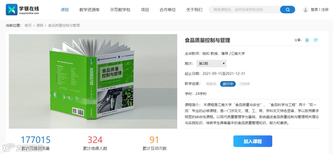 课程简介:本课程是江南大学“食品质量与安全”、“食品科学与工程”两个“双一流”专业的必修课程,是一门涉及文、理、工、商,学科交叉特色显著,学以致用要求明显的综合性课程。以现代质量管理学为基础,系统阐述食品质量控制与管理相关理论与实践知识,培养学生具备基本的食品质量管理知识、能力和素质。
