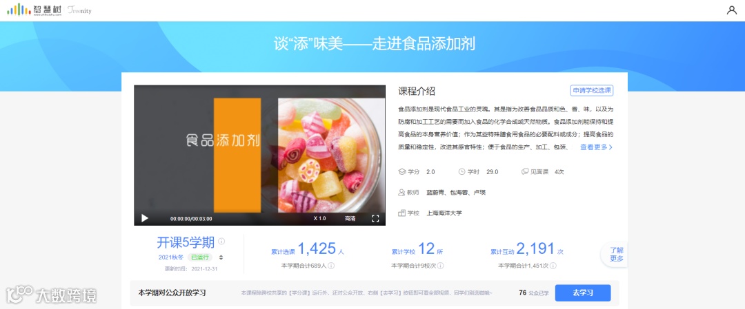 课程介绍:食品添加剂是现代食品工业的灵魂。其是指为改善食品品质和色、香、味,以及为防腐和加工工艺的需要而加入食品的化学合成或天然物质。食品添加剂能保持和提高食品的本身营养价值;作为某些特殊膳食用食品的必要配料或成分;提高食品的质量和稳定性,改进其感官特性;便于食品的生产、加工、包装、运输或贮藏。然而,近年来,国内外出现的一系列食品安全事件,使消费者对食品添加剂谈“添”色变。为消除人们对食品添加剂的恐惧心理,增强其对食品添加剂的正确认识,课程组联合开发了面向大学生通识教育的综合性课程——《谈“添”味美—走进食品添加剂》,以学生在线自主学习、现场讲授直播互动和在线讨论答疑等形式开展混合式教学。旨在普及食品安全科学知识,提升大学生对食品添加剂的正确理解与食品安全意识。