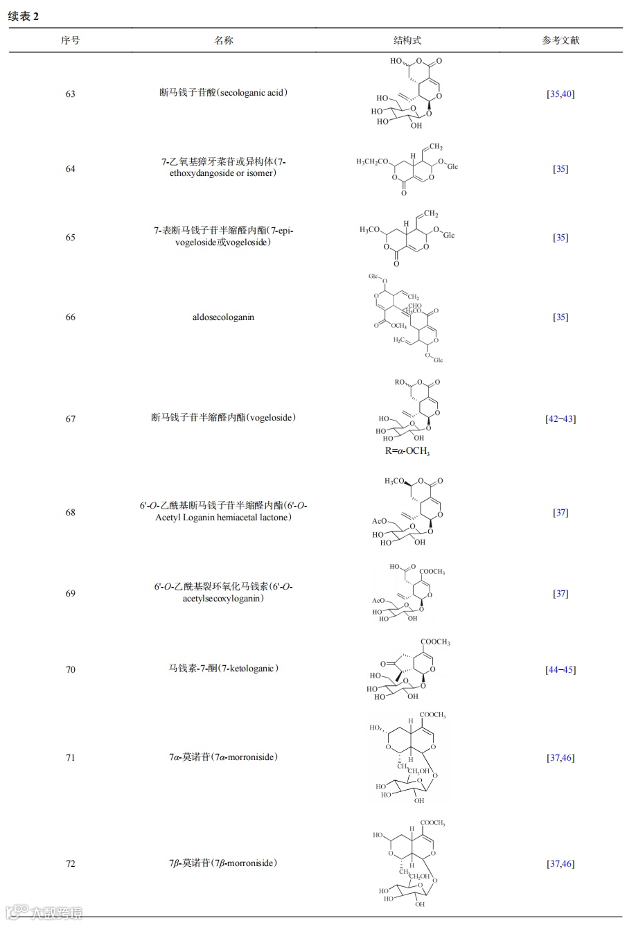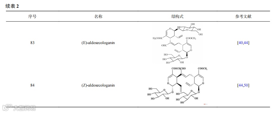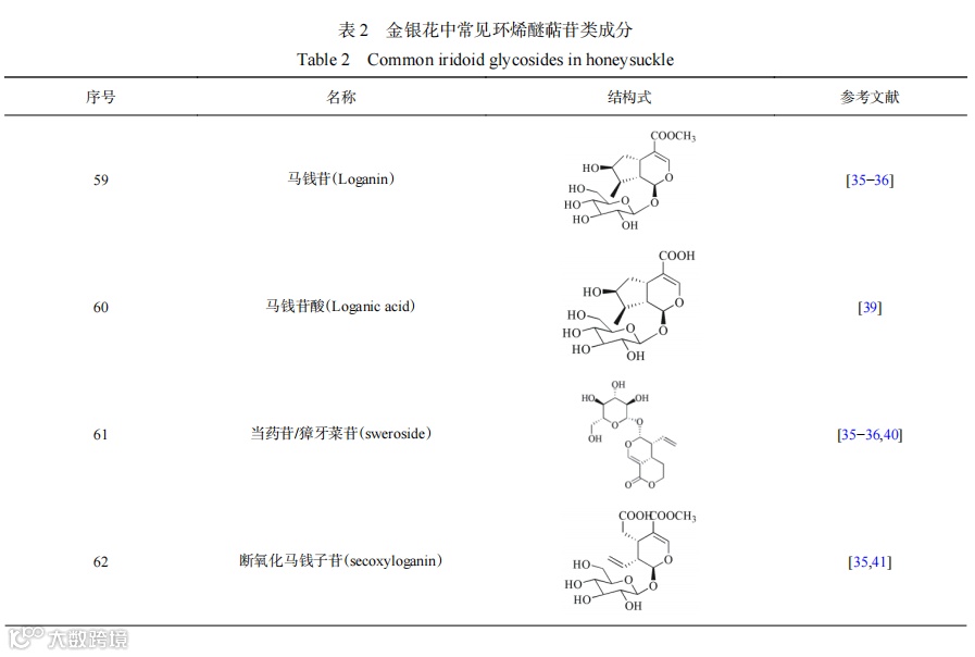 环烯醚萜苷类是金银花的主要水溶性成分,常以苷的形式存在。近年来已从金银花中提取出70多种成分,其中闭环环烯醚萜苷类约40多种,裂环环烯醚萜苷类约20多种。张丽媛等从金银花中提取分离出了7种环烯醚苷类成分,分别为马钱苷、当药苷、断氧化马钱子苷、secologanic acid、7-乙氧基獐牙菜苷或异构体、7-epi-vogeloside或vogeloside、aldosecologanin。山东和河南金银花中獐牙菜苷、马钱苷、断马钱子苷半缩醛内酯、secoxyloganin 4种环烯醚萜苷的含量存在一定差异,4种成分的含量分别为0.38%~0.46%、0.07%~0.14%、0.30%~0.38%、0.33%~0.41%和0.21%~0.33%、0.02%~0.08%、0.15%~0.32%、0.23%~0.36%。于洋等首次从金银花水提物中分离得到了6'-O-乙酰基断马钱子苷半缩醛内酯、6'-O-乙酰基裂环氧化马钱素、马钱素-7-酮、7α-莫诺苷、7β-莫诺苷和金吉苷。李畅等首次在金银花中发现1个新的环烯醚萜化合物,将其命名为裂环马钱子苷A。金银花中常见的环烯醚萜苷类成分及结构见表2。