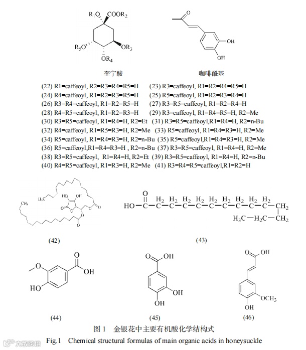 有机酸类物质是金银花的主要功能性成分之一。常见的有原儿茶酸、绿原酸、咖啡酸、阿魏酸等,其中绿原酸类物质是金银花有机酸的主要有效成分。目前已从金银花提取物中分离出约20种咖啡酸衍生物,包括1-O-咖啡酰奎宁酸(22)、3-O-咖啡酰奎宁酸(23)、4-O-咖啡酰奎宁酸(24)、5-O-咖啡酰奎宁酸(25)、3,4-O-二咖啡酰奎宁酸(26)、3,5-O-二咖啡酰奎宁酸(27)、4,5-O-二咖啡酰奎宁酸(28)、3-O-咖啡酰奎宁酸甲酯(29)、3-O-咖啡酰奎宁酸乙酯(30)、3-O-咖啡酰奎宁酸丁酯(31)、4-O-咖啡酰奎宁酸甲酯(32)、5-O-咖啡酰奎宁酸甲酯(33)、5-O-咖啡酰奎宁酸丁酯(34)、3,4-O-二咖啡酰奎宁酸甲酯(35)、3,4-O-二咖啡酰奎宁酸乙酯(36)、3,5-O-二咖啡酰奎宁酸甲酯(37)、3,5-O-二咖啡酰奎宁酸乙酯(38)、3,5-O-二咖啡酰奎宁酸丁酯(39)、4,5-O-二咖啡酰奎宁酸甲酯(40)和3,4,5-O-三咖啡酰奎宁酸(41)。此外,金银花中其它有机酸还包括棕桐酸(42)、肉豆蔻酸(43)、香草酸(44)、原儿茶酸(45)及阿魏酸(46)等。金银花中主要的有机酸类成分及结构见图1。