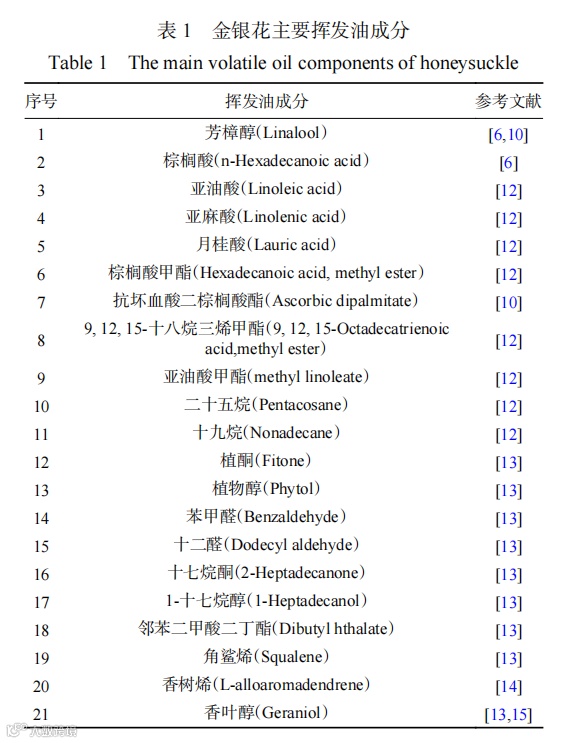 挥发油类是从金银花中鉴别出种类最多的功能性成分。近年来已鉴定出约390种,但发挥功效的主要是芳樟醇。马勤川等采用气相色谱-质谱法(GC-MS)从金银花中鉴别出27种挥发油成分,主要成分为脂肪酸,其占挥发油总量的47.01%,其中棕榈酸为19.12%,亚油酸为18.43%,亚麻酸为9.06%。肖敏等采用GC-MS从金银花叶中检测出了29种挥发油成分,并确定了26种成分,主要成分为有机酸和有机酸酯。金银花鲜花与干花中的挥发性成分差异较大,鲜花和干花中各鉴定出44种和49种成分,两者共有成分24个;鲜花主要成分为芳樟醇、金合欢醇等烯醇类及抗坏血酸二棕榈酸酯等中低沸点化合物,干花主要成分为棕榈酸甲酯、亚麻酸甲酯等酯及烷烃类中高沸点化合物。不同产地金银花的挥发性成分也存在差异,广西金银花中鉴定出35种成分,主要为亚油酸甲酯、正十六烷酸和ζ-依兰油烯等;湖南金银花中鉴定出18种成分,主要为正十六烷酸、亚油酸和α-姜黄素等。金银花中主要的挥发油成分见表1。
